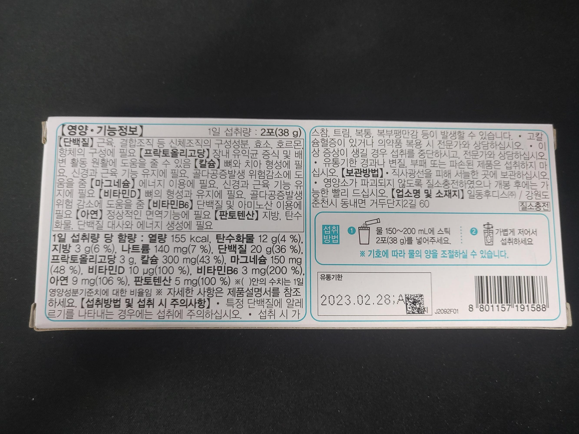 1일 섭취량은 2포 38g인데요. 여기에 열량은 155kcal 정도입니다. 칼로리도 어느정도 있는 편이고, 그외에 다양한 성분들도 각각 기준치에 충분할 정도로 들어 있다는 점도 눈에 띄는 부분이더라구요. 영양성분 전체적으로 챙기는 용도로도 나쁘지 않아보이는데요.