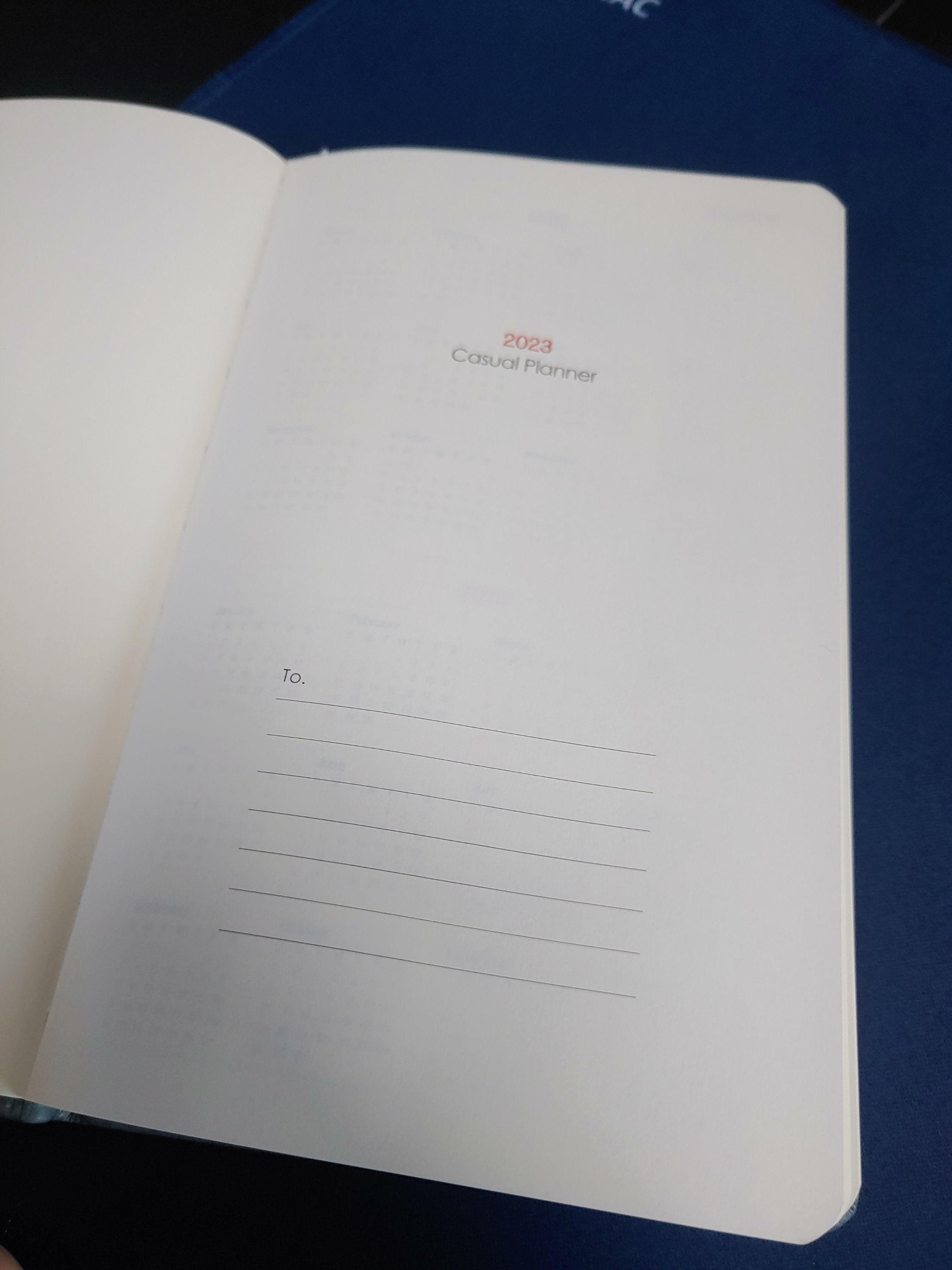 약간 고급스러운 느낌의 표면 그리고 2023년의 각인 그리고 1일 1페이지의 타입, 줄간격의 메모등등 여러가지 구성으로 되어 있었습니다. 전체적으로 세부적이고 복잡한 다이어리라기 보다는 딱 필요한 내용들을 간단하게 적고 정리할 수 있는 타입으로 보시면 될 것 같더라구요.