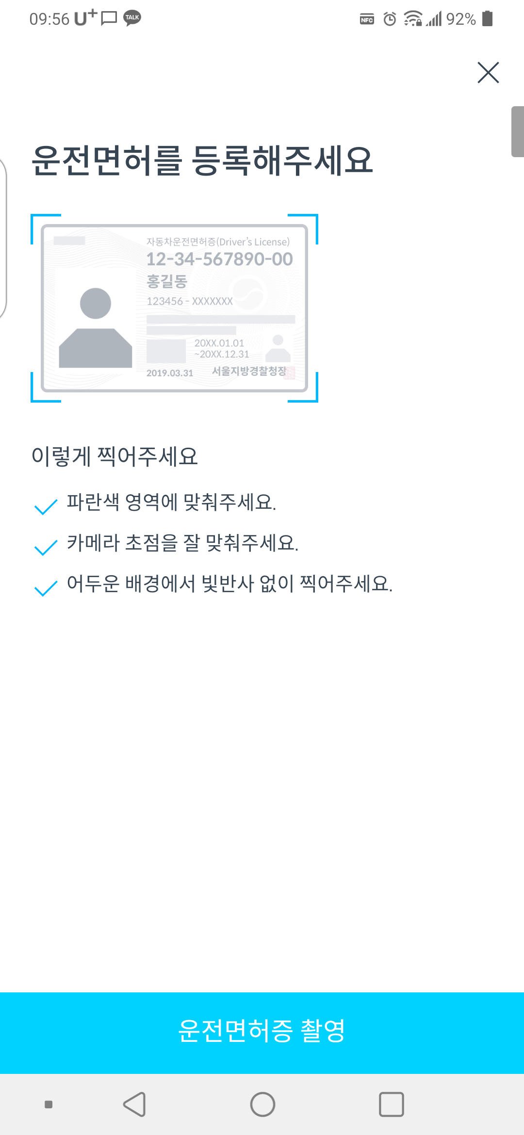 면허증 사진을 찍어서 올리는 곳인데요. 다른 어플들 경우에는 좀... 인식이 잘 안되는 경우도 있는데 쏘카는 한번에 바로 끝이 나더라구요. 인식이 끝나면 운전면허증에 내용들을 확인하는 절차를 거쳐야 합니다.