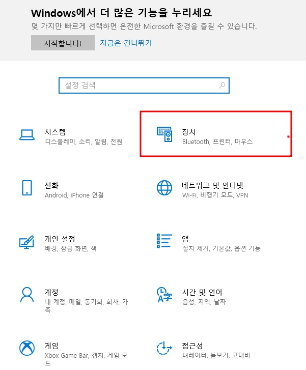 블루투스 5.0 동글을 USB에 꼽고, 윈도우에서 설정이 완료되었다면 이제 블루투스 이어폰을 연결하는 세팅을 해야하는데요. 아주 간단하게 진행이 가능합니다. 우선 윈도우 설정으로 가면 장치에서 블루투스 장치를 찾아주세요!!