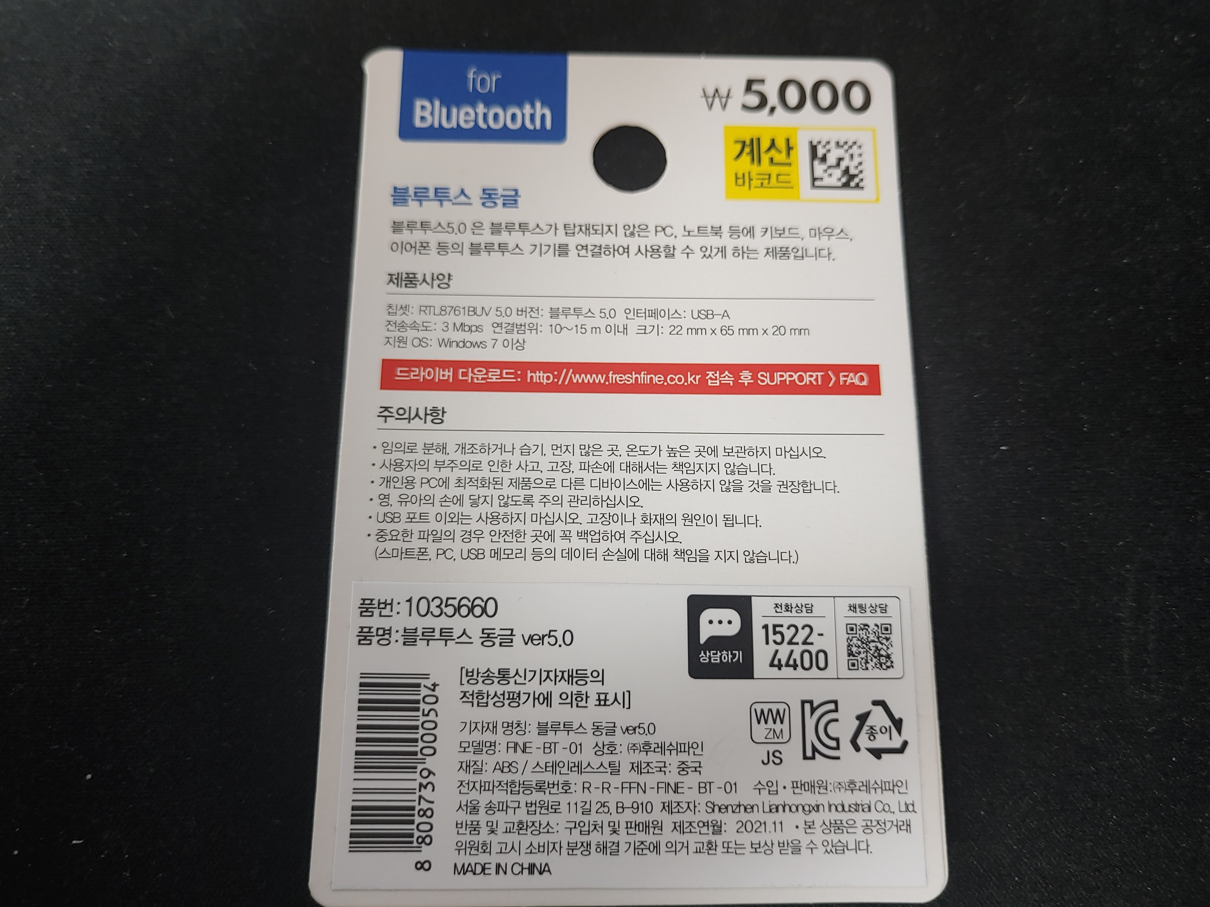 제품 사양은 블루투스 5.0 버전이며, USB-A 타입, 전송속도는 3 Mbps, 연결범위는 10~15m 이내, 크기는 22 mm*65 mm * 20mm입니다. 윈도 7 이상의 OS를 지원하고 있어요. 윈도우 10의 경우에는 별도의 드라이버 설치 없이도 USB에 연결하면 자동으로 설정이 잡혀서 연결이 되더라구요.