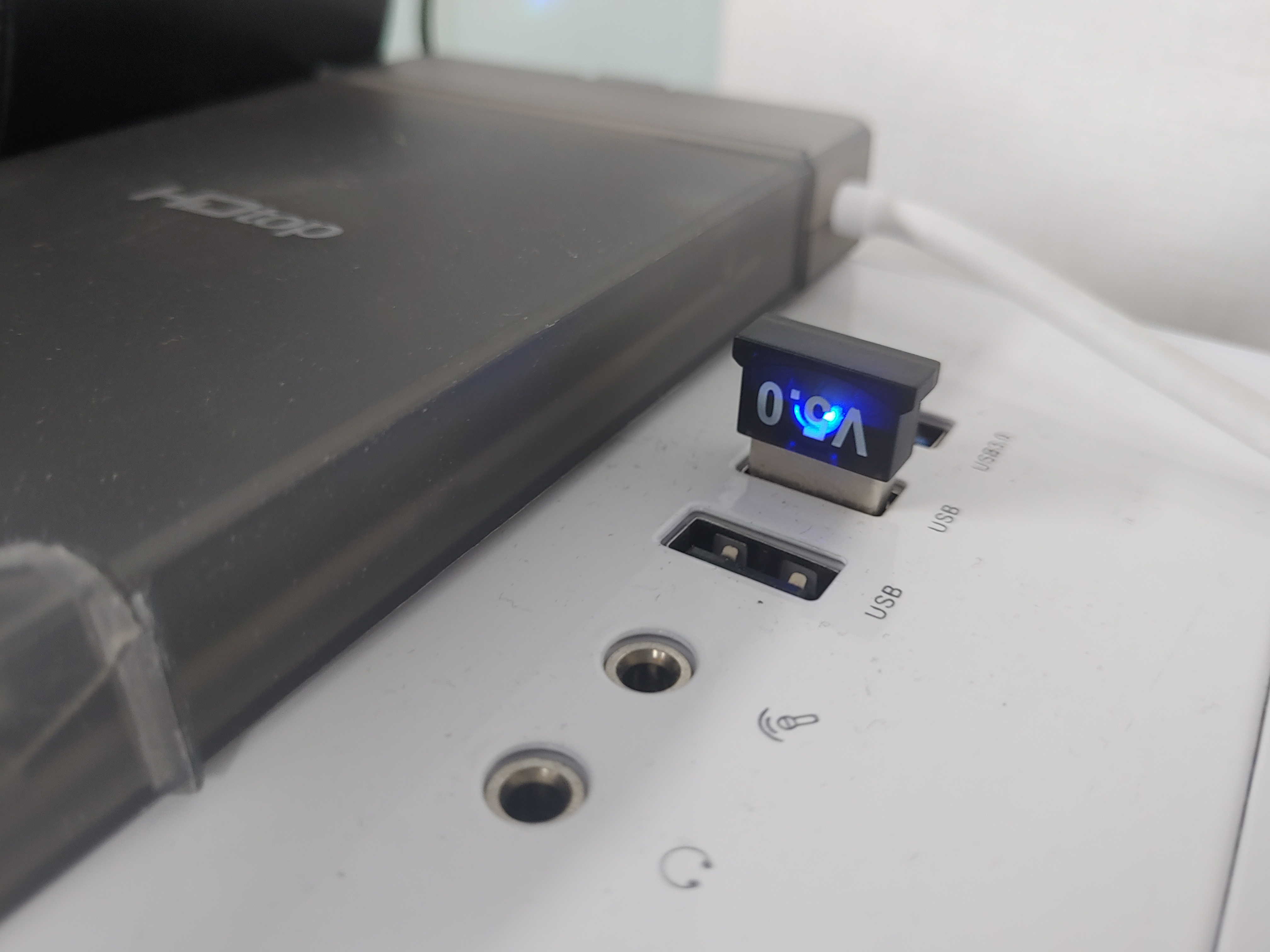 USB가 연결이되고, 설치가 돼서 연결 중인 경우에는 사진과 같이 이렇게 불빛이 들어오는데요. 불빛이 들어와 있으니까 켜져 있는지 꺼져있는지 이런 부분들은 확인할 수 있겠다 싶더라고요. 일단 불빛도 그렇고 전체적으로 깔끔하고 작다는 느낌입니다. 그리고 이번에 리뷰를 했었던 샤오미 레드미 버즈3 프로를 연결을 해봤습니다.